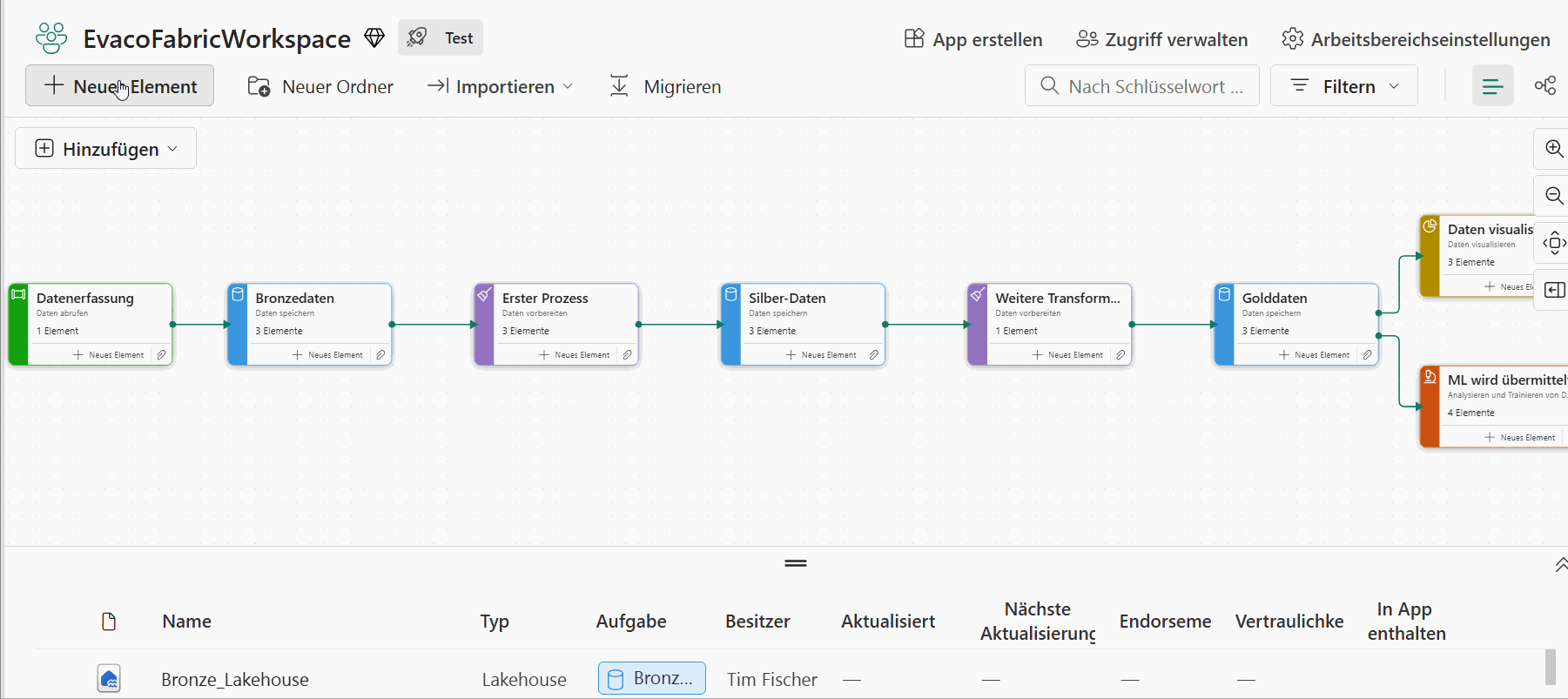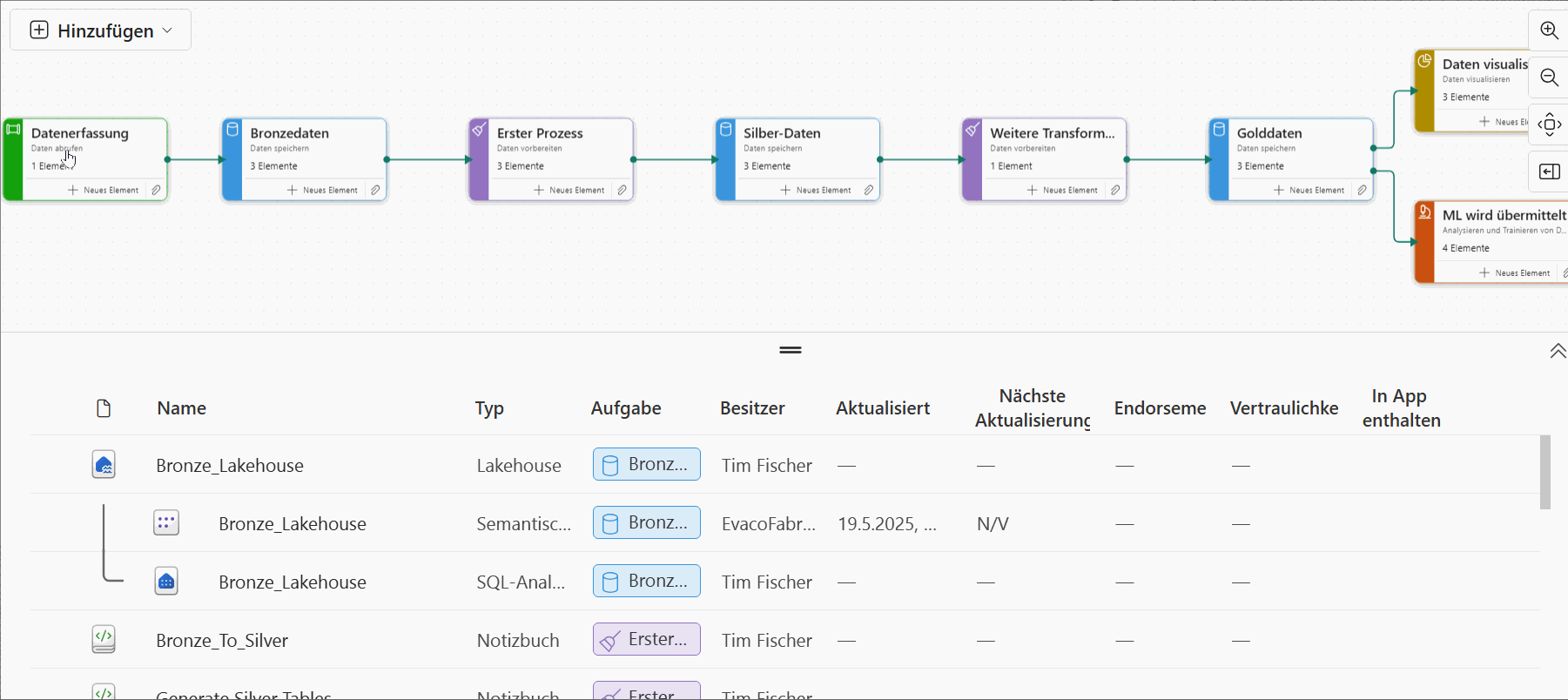 Per Drag-and-Drop kombinierst Du Dataflows, Notebooks, Data Movement oder Refreshes zu einem Workflow – manuell startbar, zeitgesteuert oder ereignisbasiert. Jeder Schritt ist transparent, jeder Lauf nachvollziehbar.