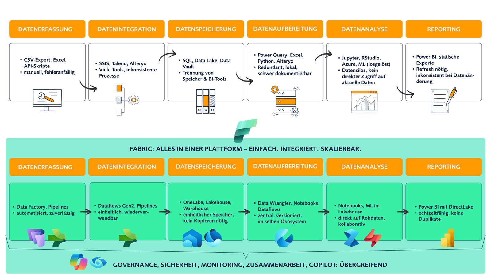 Nutze Deine bestehenden Investitionen weiter und verwandle Deine BI-Landschaft Schritt für Schritt mit Fabric.