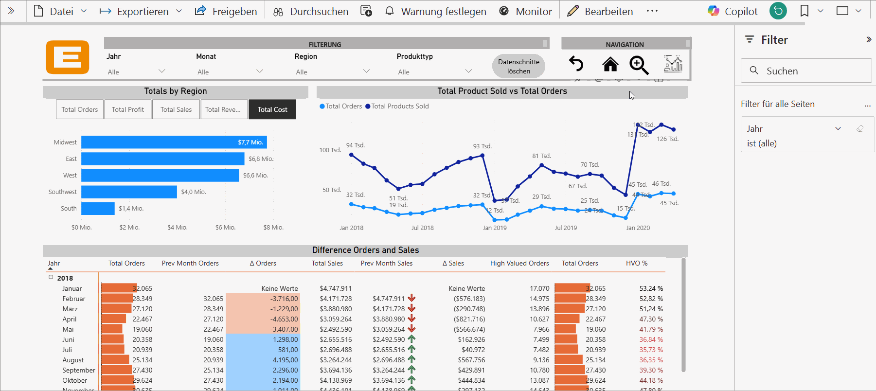 Mit einem breiten Satz an Visuals, Filtern und KPIs baust du Dashboards, die Entscheidungen stützen. Jede Interaktion ist schnell, jede Änderung sofort sichtbar – ob im Browser oder mobil.